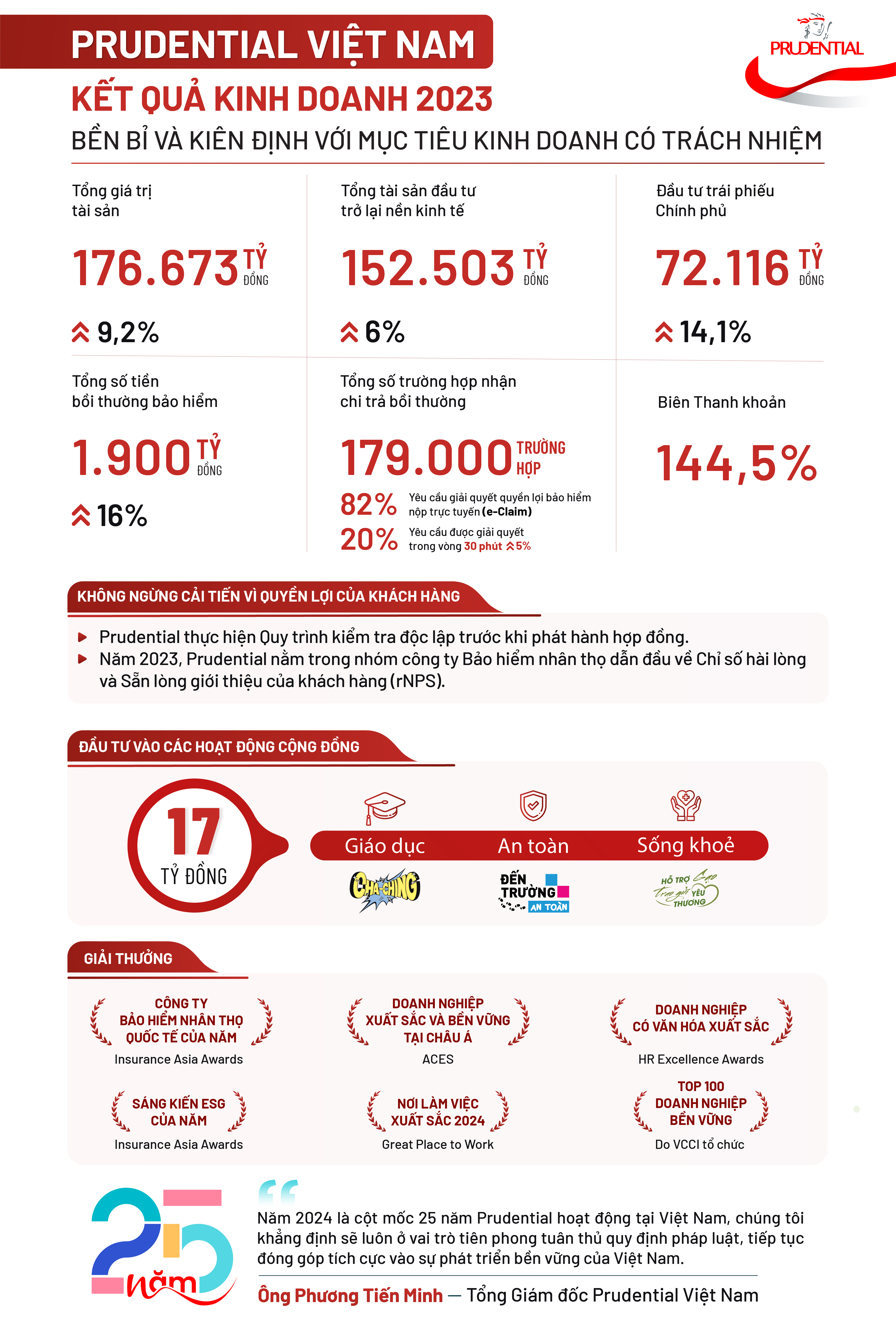 "Năm 2024 là một cột mốc đặc biệt với Prudential khi chúng tôi kỷ niệm 25 năm hoạt động tại Việt Nam. Chúng tôi khẳng định sẽ luôn tiên phong trong việc tuân thủ quy định pháp luật, tiếp tục đóng góp tích cực vào sự phát triển bền vững thông qua các dự án hỗ trợ cộng đồng và luôn đồng hành cùng Chính phủ Việt Nam thực hiện mục tiêu xây dựng nền kinh tế xanh", ông Phương Tiến Minh chia sẻ thêm.