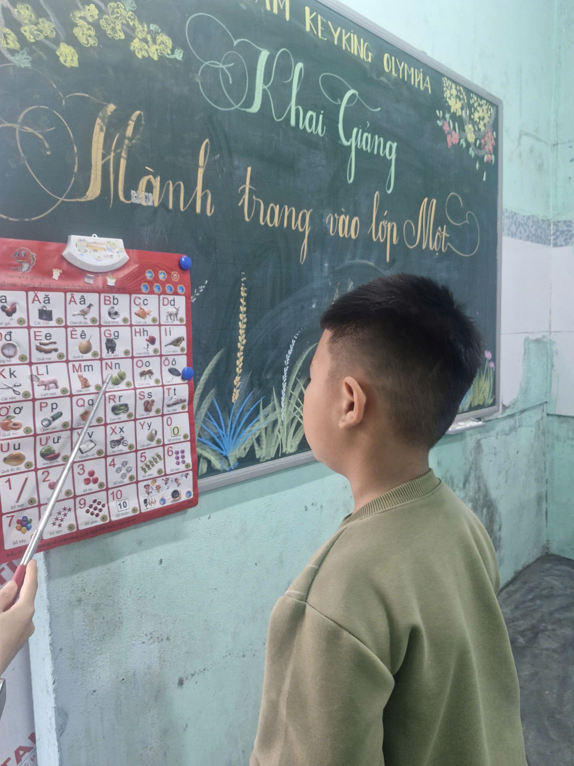 [Ảnh một bé 5 tuổi đang hào hứng làm quen với bảng chữ cái tại lớp học hiện đại]